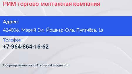 РИМ, торгово-монтажная компания по адресу 424006, Марий Эл, Йошкар-Ола, Пугачёва, 1а в дальнейшем Организация, размещена в следующих категориях: