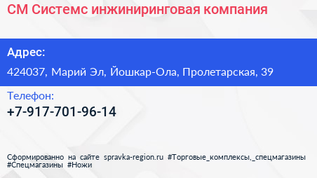 СМ-Системс, инжиниринговая компания по адресу 424037, Марий Эл, Йошкар-Ола, Пролетарская, 39 в дальнейшем Организация, размещена в следующих категориях: