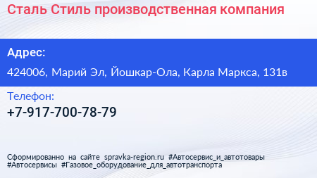 Сталь-Стиль, производственная компания по адресу 424006, Марий Эл, Йошкар-Ола, Карла Маркса, 131в в дальнейшем Организация, размещена в следующих категориях:
