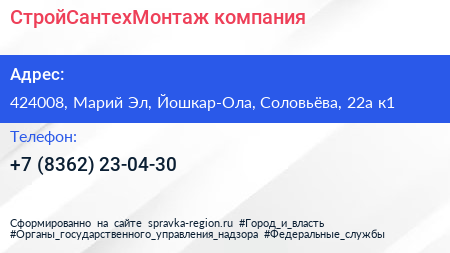 СтройСантехМонтаж, компания по адресу 424008, Марий Эл, Йошкар-Ола, Соловьёва, 22а к1 в дальнейшем Организация, размещена в следующих категориях: