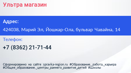 Ультра, магазин по адресу 424038, Марий Эл, Йошкар-Ола, бульвар Чавайна, 14 в дальнейшем Организация, размещена в следующих категориях: