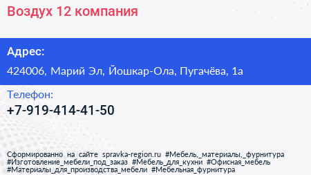 Воздух 12, компания по адресу 424006, Марий Эл, Йошкар-Ола, Пугачёва, 1а в дальнейшем Организация, размещена в следующих категориях:
