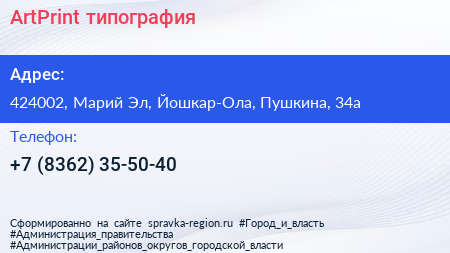 ArtPrint, типография по адресу 424002, Марий Эл, Йошкар-Ола, Пушкина, 34а в дальнейшем Организация, размещена в следующих категориях: