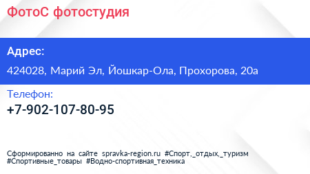 ФотоС, фотостудия по адресу 424028, Марий Эл, Йошкар-Ола, Прохорова, 20а в дальнейшем Организация, размещена в следующих категориях: