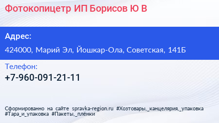 Фотокопицетр, ИП Борисов Ю.В. по адресу 424000, Марий Эл, Йошкар-Ола, Советская, 141Б в дальнейшем Организация, размещена в следующих категориях: