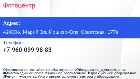 Фотоцентр по адресу 424006, Марий Эл, Йошкар-Ола, Советская, 177а в дальнейшем Организация, размещена в следующих категориях:
