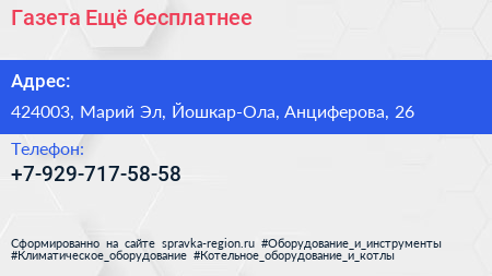 Газета Ещё бесплатнее по адресу 424003, Марий Эл, Йошкар-Ола, Анциферова, 26 в дальнейшем Организация, размещена в следующих категориях: