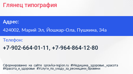 Глянец, типография по адресу 424002, Марий Эл, Йошкар-Ола, Пушкина, 34а в дальнейшем Организация, размещена в следующих категориях: