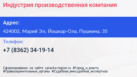Индустрия, производственная компания по адресу 424002, Марий Эл, Йошкар-Ола, Пушкина, 35 в дальнейшем Организация, размещена в следующих категориях: