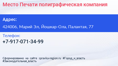 Место Печати, полиграфическая компания по адресу 424006, Марий Эл, Йошкар-Ола, Палантая, 77 в дальнейшем Организация, размещена в следующих категориях: