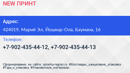 NEW ПРИНТ по адресу 424019, Марий Эл, Йошкар-Ола, Баумана, 16 в дальнейшем Организация, размещена в следующих категориях: