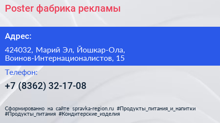 Poster, фабрика рекламы по адресу 424032, Марий Эл, Йошкар-Ола, Воинов-Интернационалистов, 15 в дальнейшем Организация, размещена в следующих категориях: