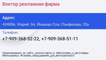 Вектор, рекламная фирма по адресу 424006, Марий Эл, Йошкар-Ола, Панфилова, 33а в дальнейшем Организация, размещена в следующих категориях: