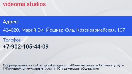 videoma studios по адресу 424020, Марий Эл, Йошкар-Ола, Красноармейская, 107 в дальнейшем Организация, размещена в следующих категориях: