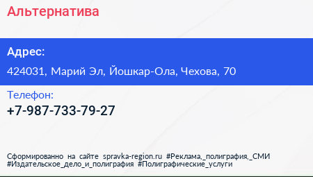 Альтернатива по адресу 424031, Марий Эл, Йошкар-Ола, Чехова, 70 в дальнейшем Организация, размещена в следующих категориях: