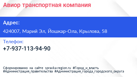Авиор, транспортная компания по адресу 424007, Марий Эл, Йошкар-Ола, Крылова, 58 в дальнейшем Организация, размещена в следующих категориях: