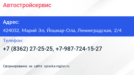 Автостройсервис по адресу 424032, Марий Эл, Йошкар-Ола, Ленинградская, 2/4 в дальнейшем Организация, размещена в следующих категориях: