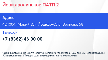 Йошкаролинское ПАТП №2 по адресу 424004, Марий Эл, Йошкар-Ола, Волкова, 58 в дальнейшем Организация, размещена в следующих категориях: