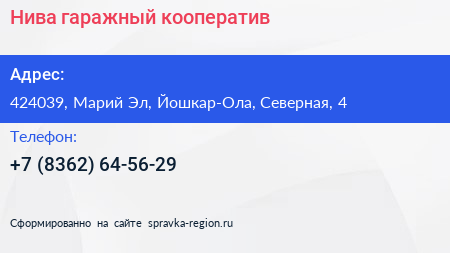 Нива, гаражный кооператив по адресу 424039, Марий Эл, Йошкар-Ола, Северная, 4 в дальнейшем Организация, размещена в следующих категориях: