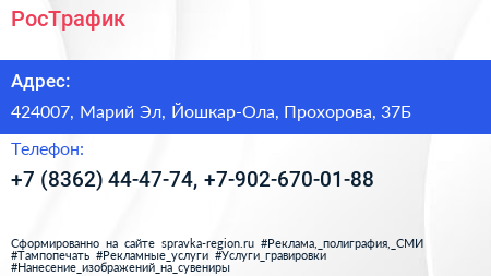 РосТрафик по адресу 424007, Марий Эл, Йошкар-Ола, Прохорова, 37Б в дальнейшем Организация, размещена в следующих категориях: