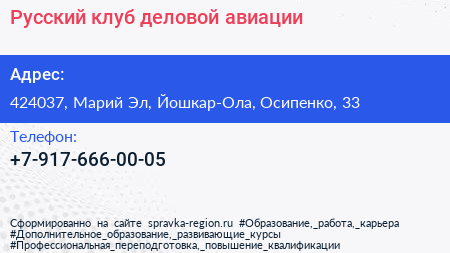 Русский клуб деловой авиации по адресу 424037, Марий Эл, Йошкар-Ола, Осипенко, 33 в дальнейшем Организация, размещена в следующих категориях: