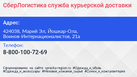 СберЛогистика, служба курьерской доставки по адресу 424038, Марий Эл, Йошкар-Ола, Воинов-Интернационалистов, 21а в дальнейшем Организация, размещена в следующих категориях: