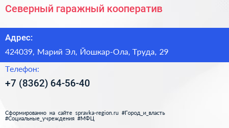 Северный, гаражный кооператив по адресу 424039, Марий Эл, Йошкар-Ола, Труда, 29 в дальнейшем Организация, размещена в следующих категориях: