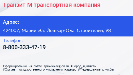 Транзит-М, транспортная компания по адресу 424007, Марий Эл, Йошкар-Ола, Строителей, 98 в дальнейшем Организация, размещена в следующих категориях: