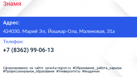 Знамя по адресу 424030, Марий Эл, Йошкар-Ола, Малиновая, 31а в дальнейшем Организация, размещена в следующих категориях: