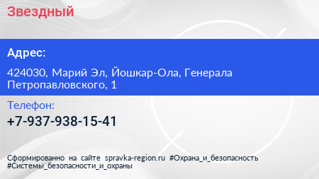 Звездный по адресу 424030, Марий Эл, Йошкар-Ола, Генерала Петропавловского, 1 в дальнейшем Организация, размещена в следующих категориях: