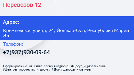 Перевозов 12 по адресу Кремлёвская улица, 24, Йошкар-Ола, Республика Марий Эл в дальнейшем Организация, размещена в следующих категориях: