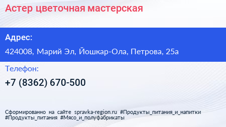 Астер, цветочная мастерская по адресу 424008, Марий Эл, Йошкар-Ола, Петрова, 25а в дальнейшем Организация, размещена в следующих категориях: