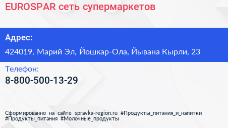 EUROSPAR, сеть супермаркетов по адресу 424019, Марий Эл, Йошкар-Ола, Йывана Кырли, 23 в дальнейшем Организация, размещена в следующих категориях: