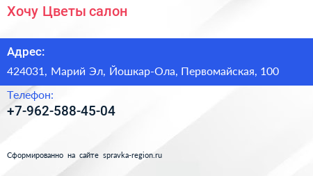 Хочу Цветы, салон по адресу 424031, Марий Эл, Йошкар-Ола, Первомайская, 100 в дальнейшем Организация, размещена в следующих категориях: