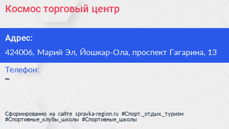 Космос, торговый центр по адресу 424006, Марий Эл, Йошкар-Ола, проспект Гагарина, 13 в дальнейшем Организация, размещена в следующих категориях: