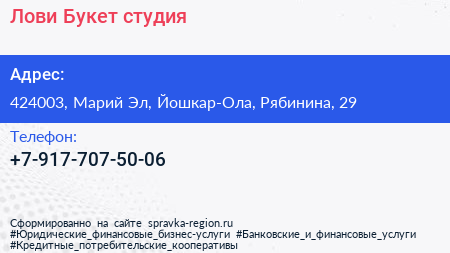Лови Букет, студия по адресу 424003, Марий Эл, Йошкар-Ола, Рябинина, 29 в дальнейшем Организация, размещена в следующих категориях: