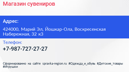 Магазин сувениров по адресу 424000, Марий Эл, Йошкар-Ола, Воскресенская Набережная, 32 к3 в дальнейшем Организация, размещена в следующих категориях: