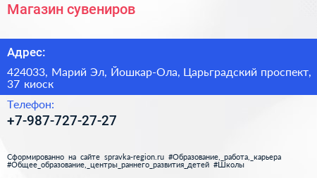 Магазин сувениров по адресу 424033, Марий Эл, Йошкар-Ола, Царьградский проспект, 37 киоск в дальнейшем Организация, размещена в следующих категориях: