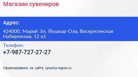 Магазин сувениров по адресу 424000, Марий Эл, Йошкар-Ола, Воскресенская Набережная, 12 к1 в дальнейшем Организация, размещена в следующих категориях: