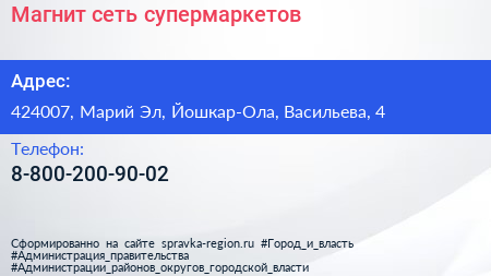 Магнит, сеть супермаркетов по адресу 424007, Марий Эл, Йошкар-Ола, Васильева, 4 в дальнейшем Организация, размещена в следующих категориях: