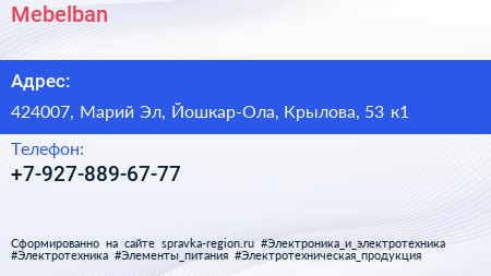 Mebelban по адресу 424007, Марий Эл, Йошкар-Ола, Крылова, 53 к1 в дальнейшем Организация, размещена в следующих категориях: