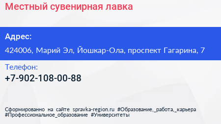 Местный, сувенирная лавка по адресу 424006, Марий Эл, Йошкар-Ола, проспект Гагарина, 7 в дальнейшем Организация, размещена в следующих категориях: