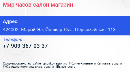 Мир часов, салон-магазин по адресу 424002, Марий Эл, Йошкар-Ола, Первомайская, 113 в дальнейшем Организация, размещена в следующих категориях: