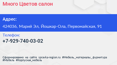 Много Цветов, салон по адресу 424036, Марий Эл, Йошкар-Ола, Первомайская, 91 в дальнейшем Организация, размещена в следующих категориях: