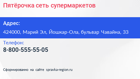 Пятёрочка, сеть супермаркетов по адресу 424000, Марий Эл, Йошкар-Ола, бульвар Чавайна, 33 в дальнейшем Организация, размещена в следующих категориях: