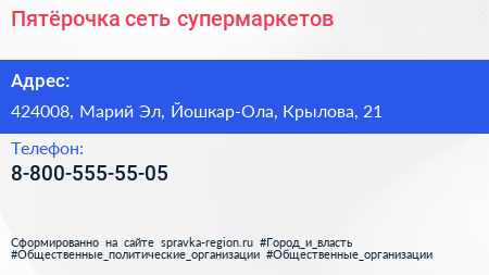 Пятёрочка, сеть супермаркетов по адресу 424008, Марий Эл, Йошкар-Ола, Крылова, 21 в дальнейшем Организация, размещена в следующих категориях: