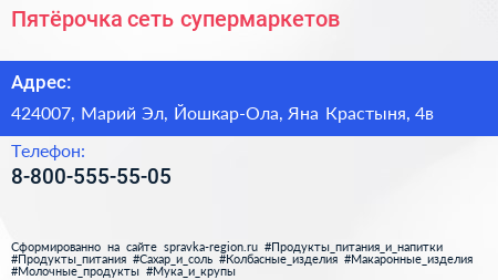 Пятёрочка, сеть супермаркетов по адресу 424007, Марий Эл, Йошкар-Ола, Яна Крастыня, 4в в дальнейшем Организация, размещена в следующих категориях: