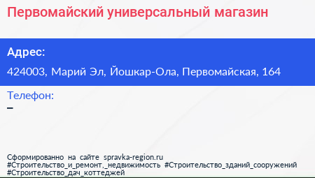 Первомайский, универсальный магазин по адресу 424003, Марий Эл, Йошкар-Ола, Первомайская, 164 в дальнейшем Организация, размещена в следующих категориях: