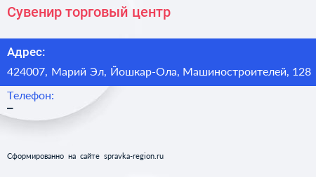 Сувенир, торговый центр по адресу 424007, Марий Эл, Йошкар-Ола, Машиностроителей, 128 в дальнейшем Организация, размещена в следующих категориях: