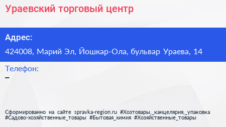 Ураевский, торговый центр по адресу 424008, Марий Эл, Йошкар-Ола, бульвар Ураева, 14 в дальнейшем Организация, размещена в следующих категориях: